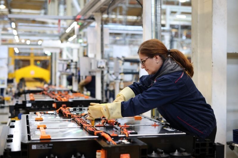 Noua linie de producție pentru vehicule electrice include o serie de stații automatizate, operate de roboți și coboți, precum și stații manuale, operate de personal uman.