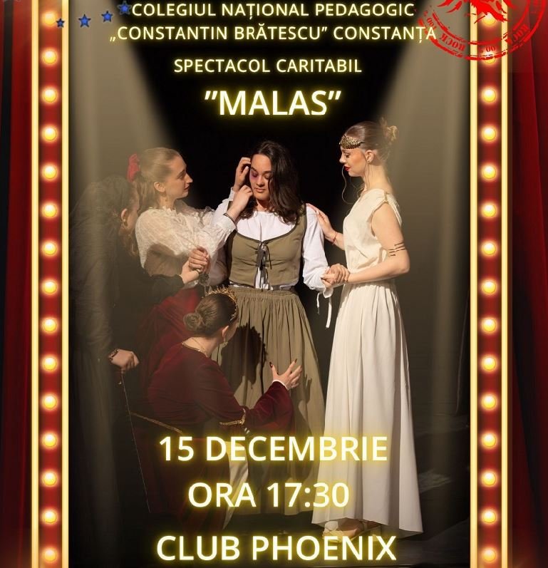 Trupa de teatru a Colegiului Național Pedagogic „Constantin Brătescu” prezintă, luni 15 decembrie, de la ora 17:30, la Club Phoenix din Constanța, spectacolul caritabil „MALAS”, în limba spaniolă. Piesa, laureată cu Premiul I la Festivalul Național de Teatru Școlar în limba spaniolă, ediția XIX, s-a calificat la Festivalul Internațional de Teatru Școlar în limba spaniolă, ediția XXVI, organizat de Ambasada Spaniei și Ministerul Educației.