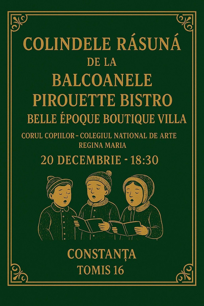 Spiritul sărbătorilor de iarnă va prinde viață în Constanța pe 20 decembrie 2025, când copiii din Corul Colegiului Național de Arte „Regina Maria” vor susține un concert special de colinde. Evenimentul va avea loc la Balcoanele Pirouette Bistro și Belle Époque Boutique Villa, situate pe bulevardul Tomis 16, începând cu ora 18:30.