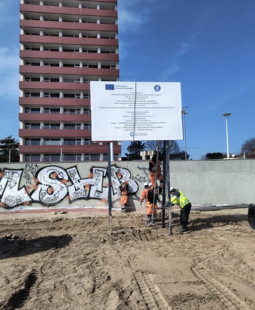 Echipele de la Apele Române Dobrogea-Litoral lucrează în ritm alert pe litoralul sudic al Mării Negre, fără oprire, pentru protejarea și reabilitarea zonei costiere. Panourile informative instalate în teren oferă detalii despre lucrările în desfășurare și despre impactul proiectului asupra mediului și infrastructurii.