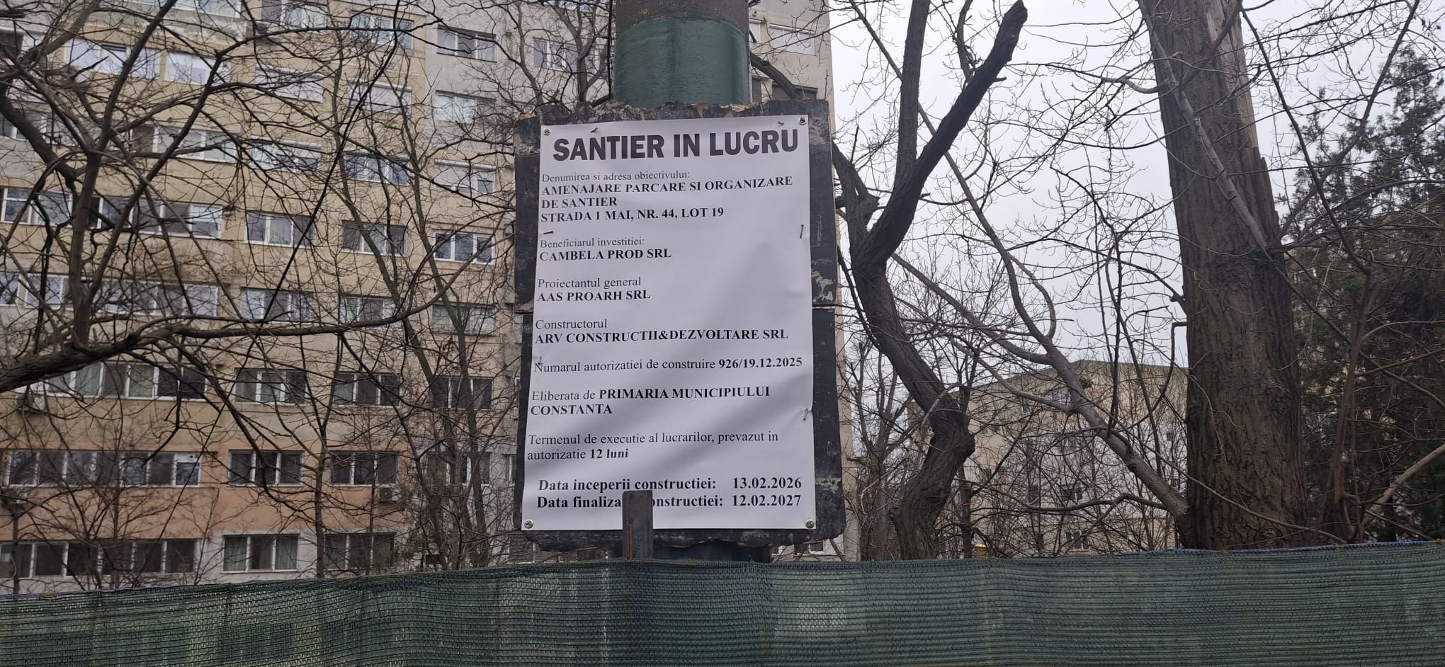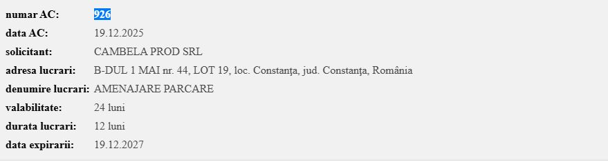 Potrivit panoului amplasat la fața locului, investiția aparține societății CAMBELA PROD SRL și este realizată în baza Autorizației de construire nr. 926 din 19 decembrie 2025, cu termen de începere a lucrărilor 13 februarie 2026. Proiectul este descris drept „Amenajare parcare și organizare de șantier”, pe strada 1 Mai nr. 44, lot 19.